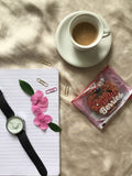 Когато комбинирате киселия вкус на боровинки и червени боровинки с деликатната сладост на капки какаово масло в бисквитка, вие сте обречени на успех! Червеният цвят и неустоимият вкус го правят специален и необикновен. Цветът идва от цвеклото на прах, а мекият вкус идва от сиропите от кокос и фурми.